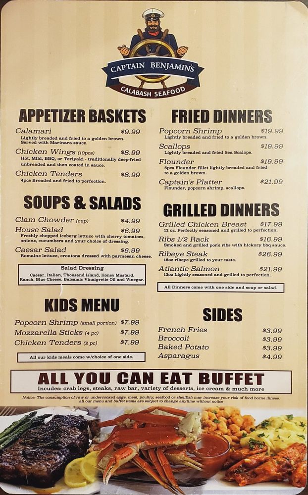 Welcome to Captain Benjamin's Calabash Seafood Buffet, a seaside gem located in Myrtle Beach, SC. This buffet-style eatery is a paradise for seafood lovers, offering a vast array of dishes that celebrate the flavors of the ocean. From succulent crab legs to perfectly fried seafood, each item is prepared fresh and served in generous portions.